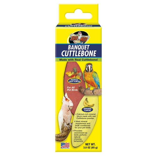 Zoo Med’s Cuttlebone Mineral Blocks are a calcium-rich supplement and beak conditioner for all pet birds. Made with real cuttlebone powder, these blocks provide essential calcium for bone and overall health while encouraging natural chewing behaviors to help keep beaks properly trimmed. Each pack includes two flavored blocks—Tropical Fruit and Banana—offering both nutrition and enrichment for your feathered friend.
